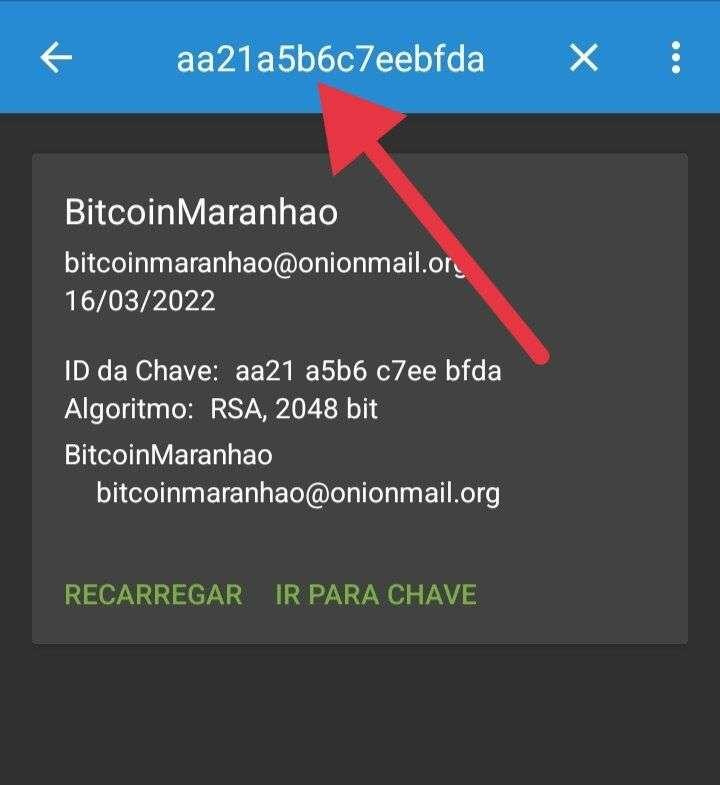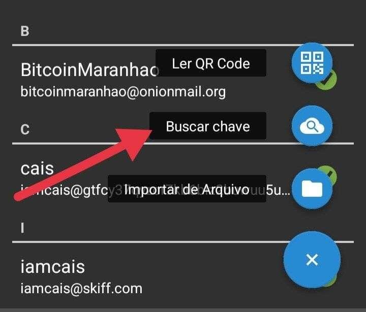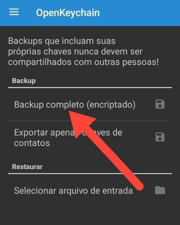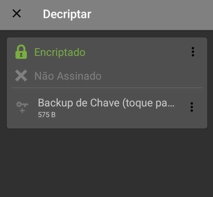 Dica: Se ocorrer algum erro ao compartilhar sua chave pública com um amigo, peça para que ele a criptografe para ele mesmo. Isso permitirá que ele adicione a chave corretamente. Caso a chave pública ainda não esteja no dispositivo, ao clicar em "Backup de chave", aparecerá a opção para importá-la. Se a chave já estiver no dispositivo, essa ação irá recarregá-la