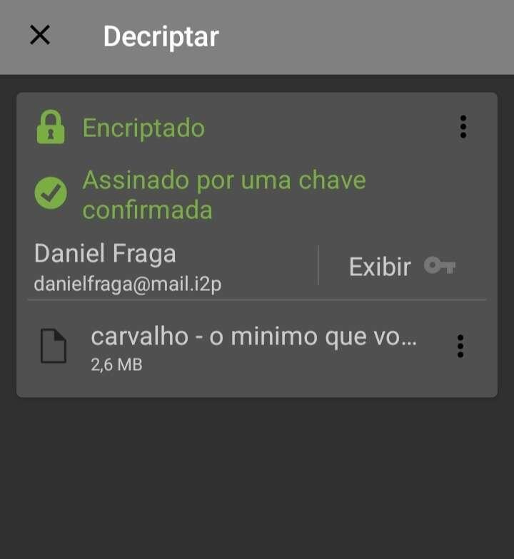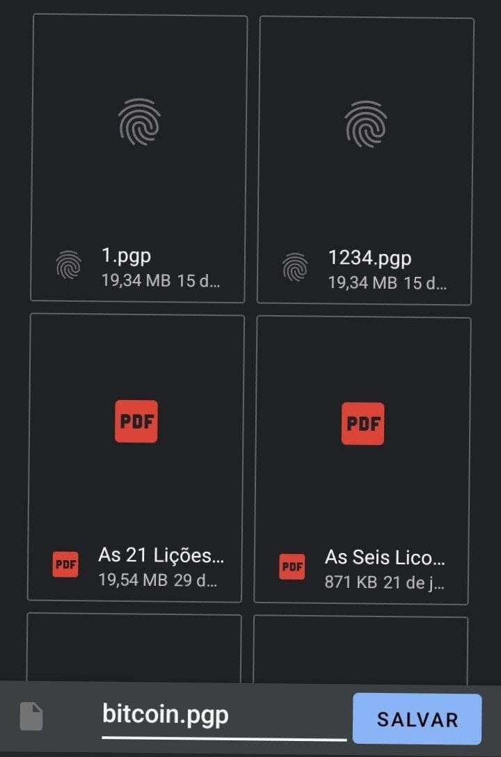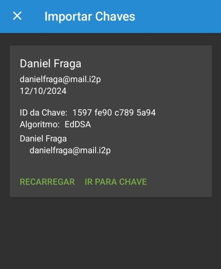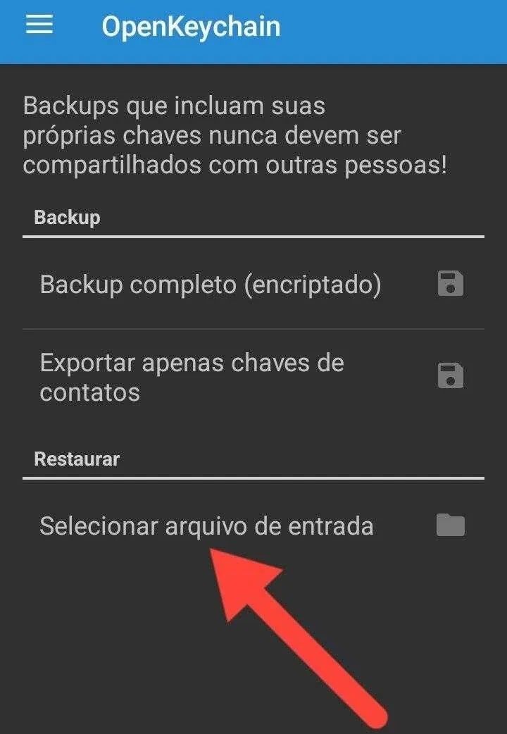 Caso você precise restaurar suas chaves PGP a partir de um backup, o OpenKeychain também facilita o processo de importação. Siga os passos abaixo para restaurar sua chave PGP: