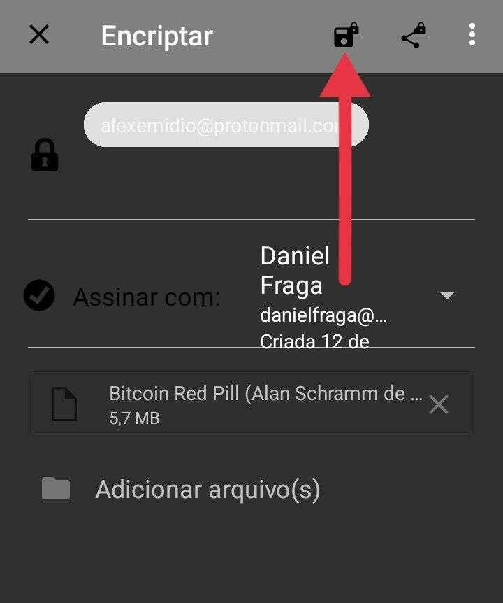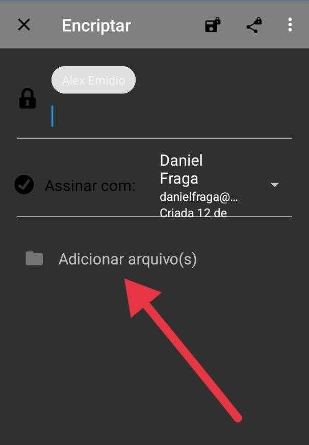 Passo 4 : os passos a seguir são os mesmo que você seguiu pra encriptar a mensagem texto. Ítens "Encriptar para:" "Assinar com:”