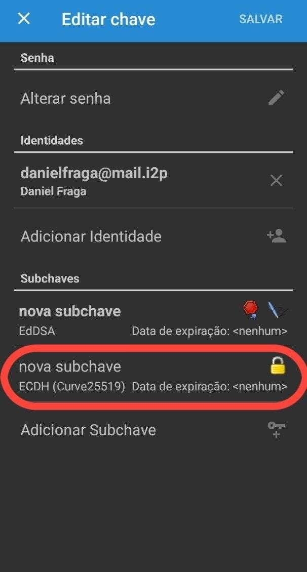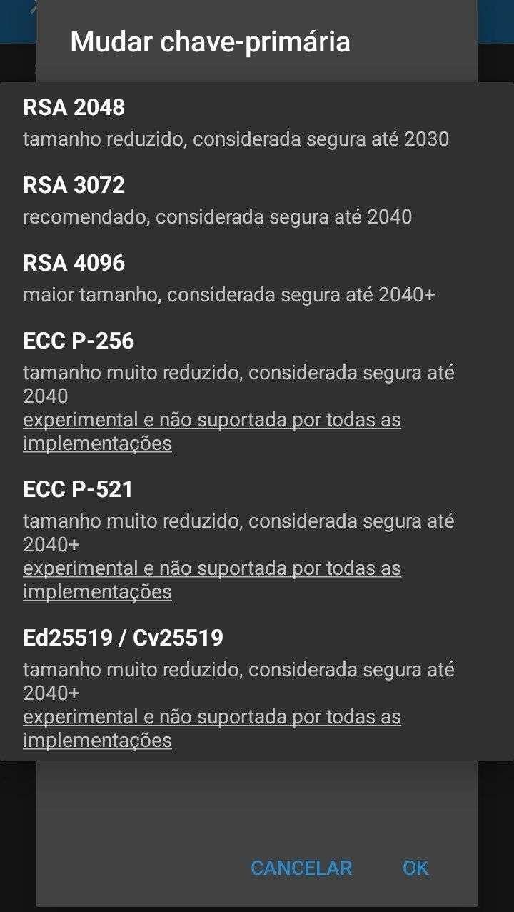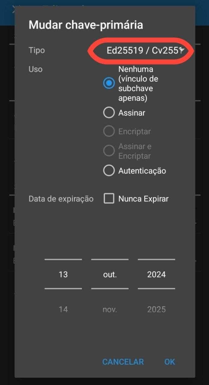 Ao cliclar em ' nova subchave ' pode alterar a data de expiração e pode mudar a criptografia usado na chave cliclando opção ed2255/cv255