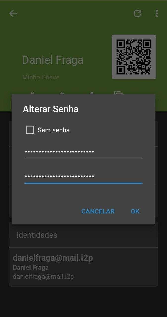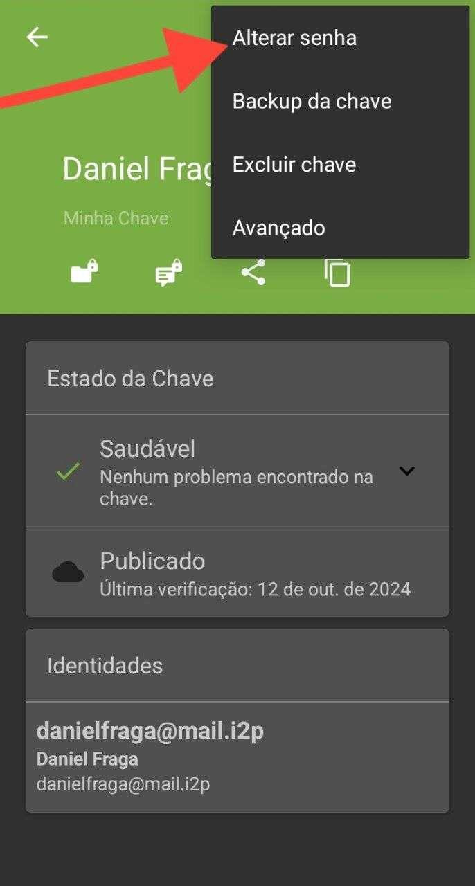 Para definir a senha, clique na sua chave PGP, acesse o menu no canto superior direito e selecione "Alterar senha"