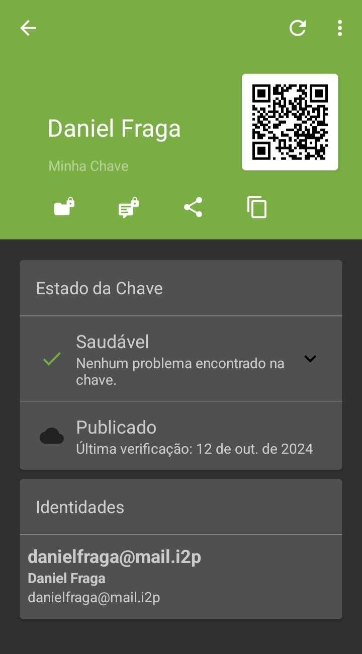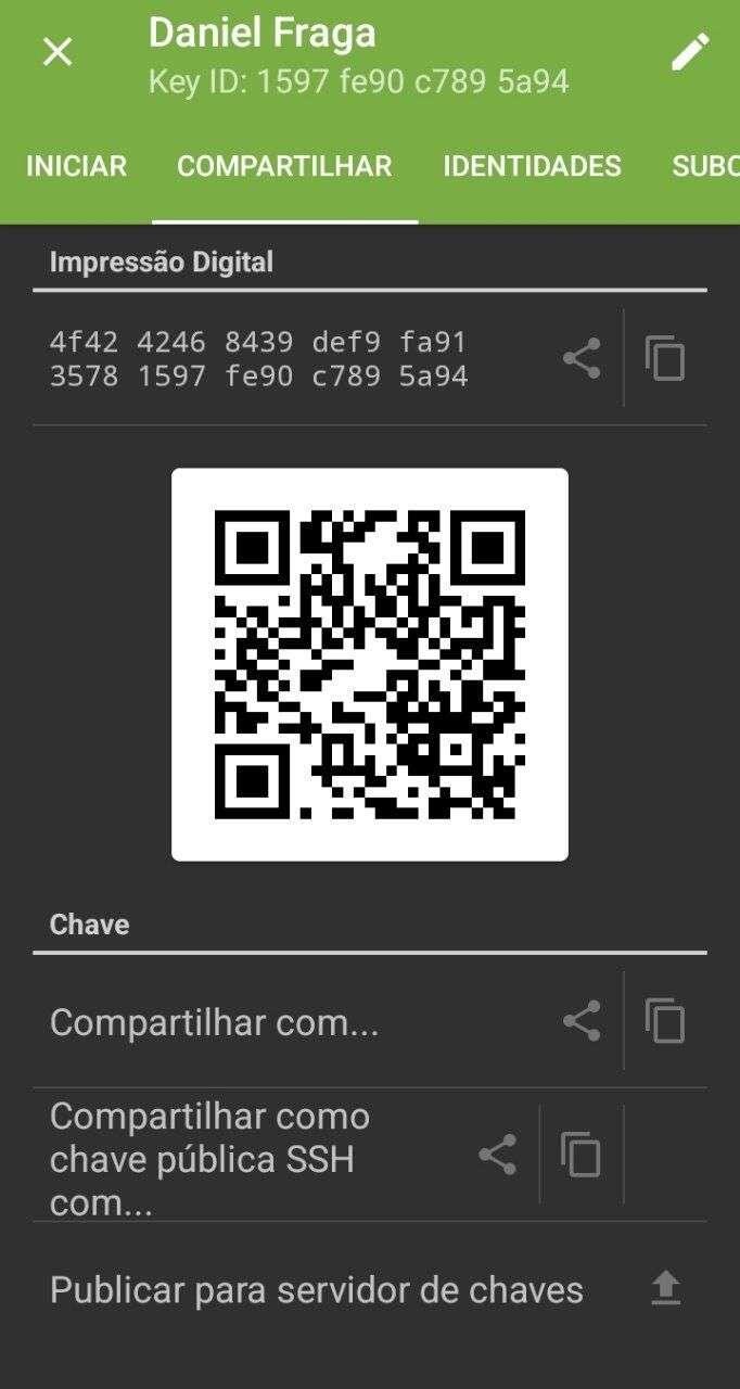 Na seção "Compartilhar", você verá sua Key ID e terá a opção de publicar sua chave PGP em um servidor de chaves