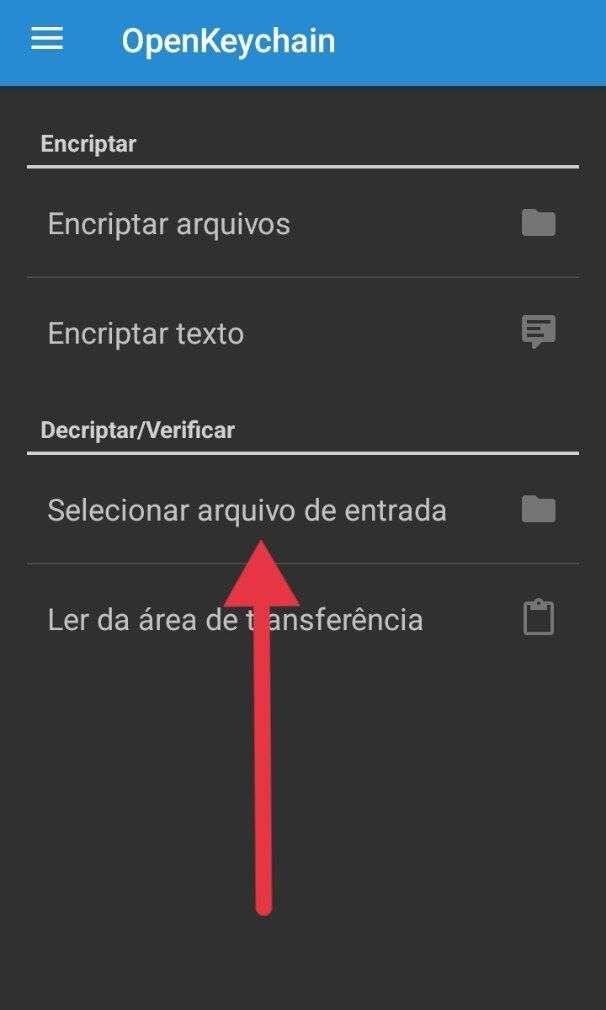 Abra o OpenKeychain, acesse o menu lateral no canto superior esquerdo e escolha a opção "Selecionar arquivo de entrada" para localizar o arquivo de backup que você deseja importar.