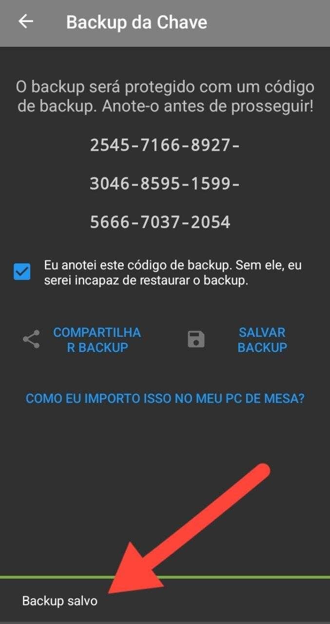 Passo 4: O backup será protegido por um código de backup gerado automaticamente. Anote esse código em um papel e guarde local seguro, pois sem ele você não conseguirá recuperar suas chaves PGP. Após anotar o código, marque a opção “Anotei o código” e clique em Salvar Backup. Obs: todas as vezes que você for fazer o backup da sua chave PGP vai ser criado um novo código aleatório.