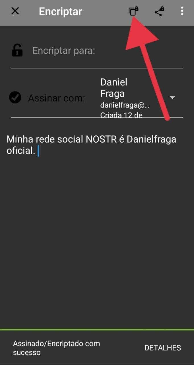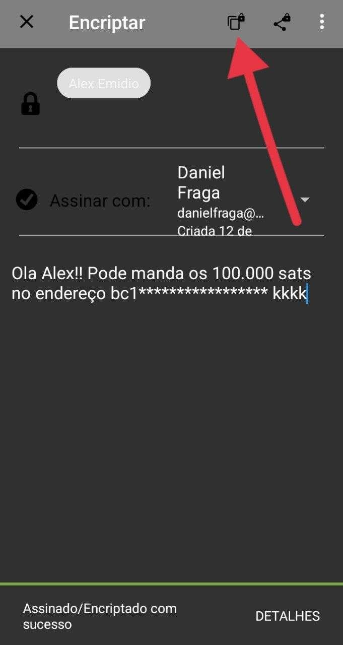 Passo 4: Clique no ícone indicado pela seta para copiar o texto assinado. Uma mensagem aparecerá informando: "Assinado/Encriptado com Sucesso".